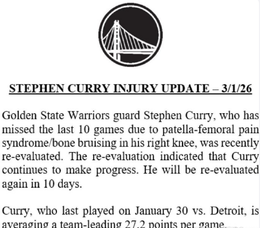北京时间3月2日,当库里生涯第2次因伤缺席整个2月份的比赛,如今根据勇士官方伤病报告显示,库里将在10天后去复诊他的跑步膝,也将至少再缺席5场比赛,对于勇士整体战斗力是极大的削弱。